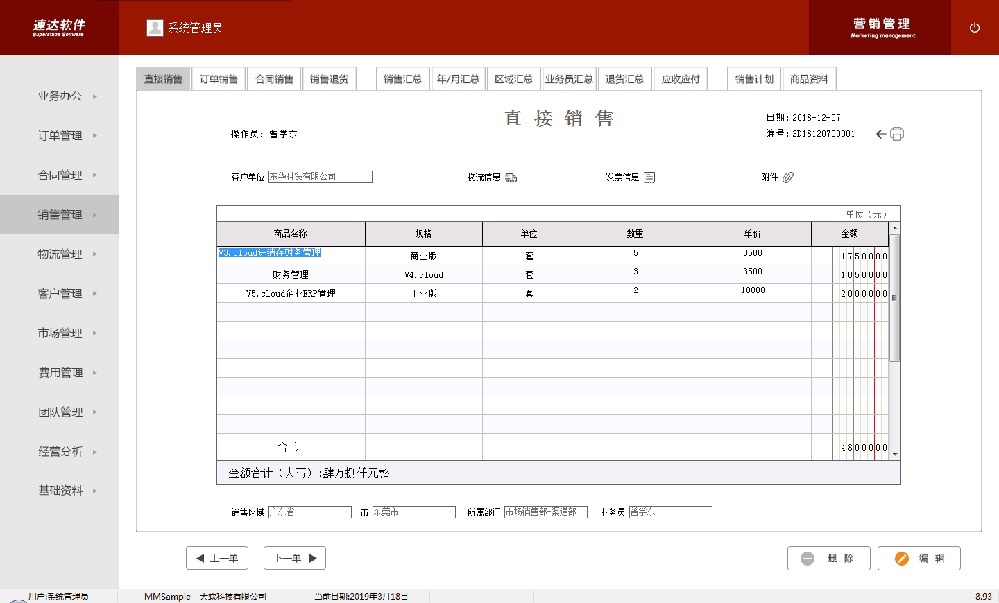 直接销售、订单销售、合同销售、销售退货、销售汇总、年/月汇总、区域汇总、业务员汇总、退货汇总、应收应付、销售计划 |