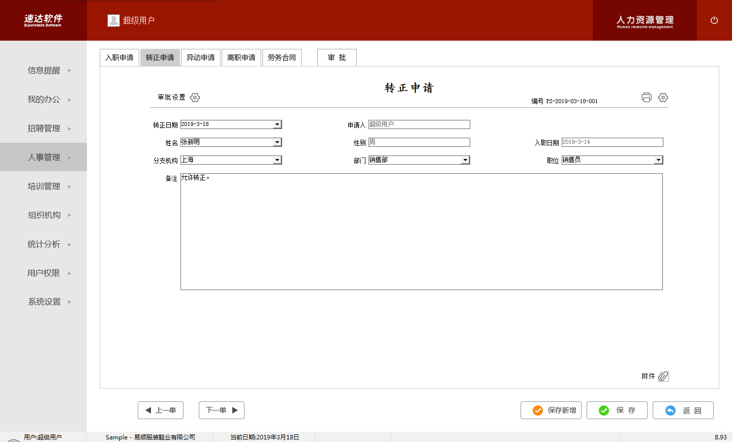 入职申请、转正申请、异动申请、离职申请、劳动合同 |